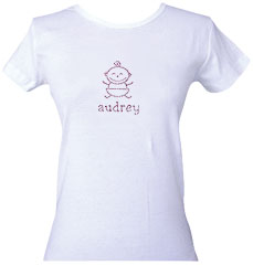 Baby T-shirt design and optional name letters (all lower case) in your choice of crystal rhinestone colors.